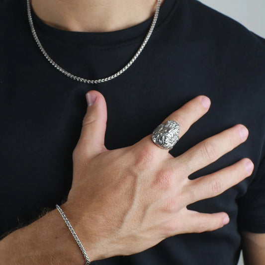 Anillos resistentes al agua: fabricados con acero inoxidable chapado en oro de 18k y diseñados para lucirse de día y de noche. Nuestros anillos se pueden mojar, pero nunca se decoloran ni pierden el brillo.